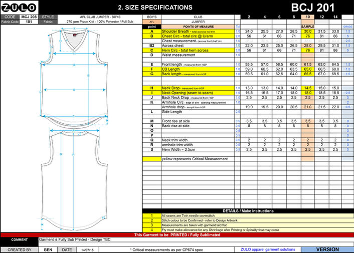 Technical Garment Engineering - size specs